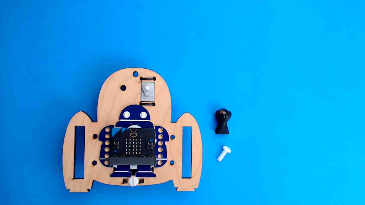 Now for the fun part, let’s add the ball roller underneath so GrabbE can glide like a pro! Stick a bolt through the hole at the very top center of your base, just above where the eye gears go. From underneath, screw the ball roller onto the bolt nice and tight.